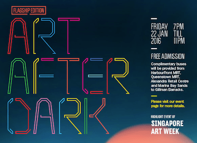 Art After Dark #GillmanBarracks Event: Singapore’s Art Week 2016 Source: Gillman Barracks, Singapore Share this: Click to share on X (Opens in new window) X Click to share on Facebook (Opens in new window) Facebook Like Loading...