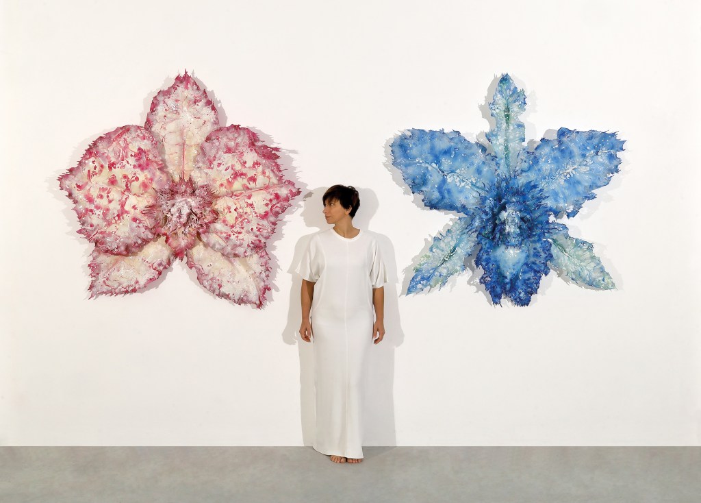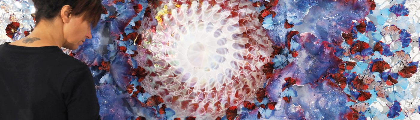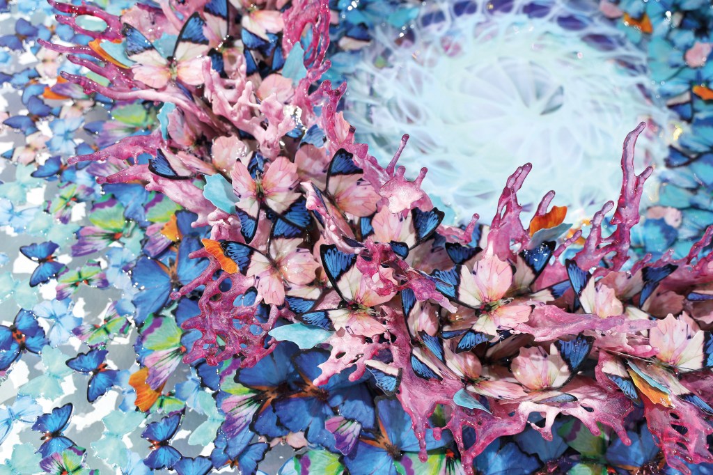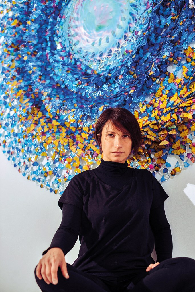 She observes, listens, reflects, and reworks in nature and from nature, resulting in her most visionary creativity. Whirlwinds of exploding butterflies and perpetually bursting water that gush at the observer create micro and macro cosmos that transform forms in a dreamlike and expanded time where anything is possible.