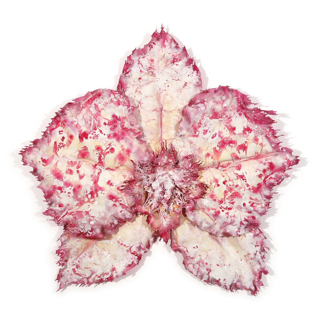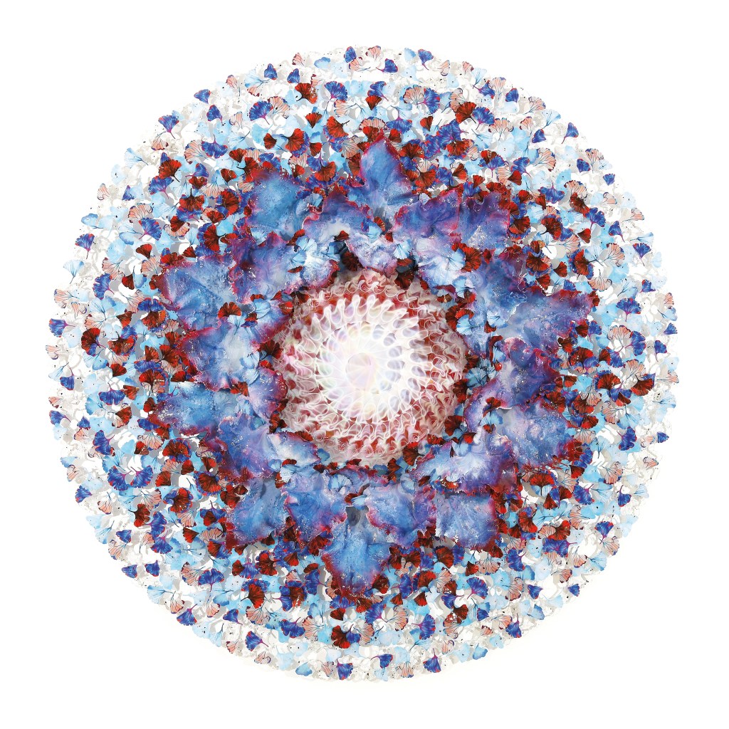 In whimsical arrangements that play with the depth of time and space, Annalù’s mandala designs seem to transcend the constraints of time and form, existing in a metamorphic realm of three-dimensionality. She explains that they are actually “intended to convey an expanded time where the form holds the value of a mandala and the perception of time is expanded.”