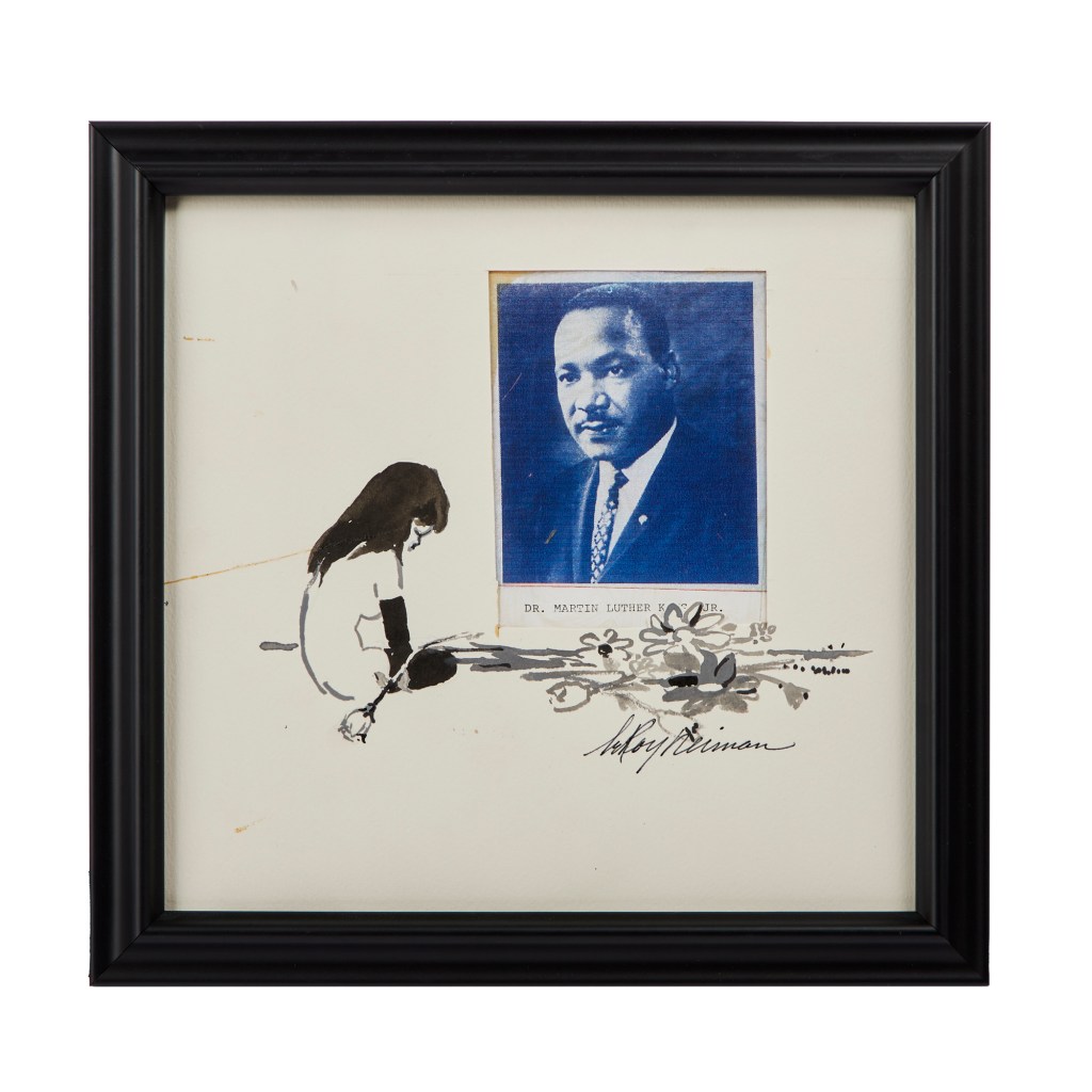 - LeRoy Neiman original pen, ink, watercolor, and collage drawing of a Femlin grieving before a photograph of the late Martin Luther King, Jr., with annotations from the original Playboy Magazine layout ($4,000-$6,000)