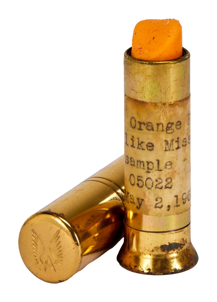 - Marilyn Monroe’s custom shade of Elizabeth Arden lipstick in a goldtone case with typewritten label reading “Orange Pink like Miss I./ sample 05022/ May 2, 1960” ($7,000-$8,000)