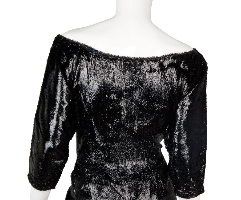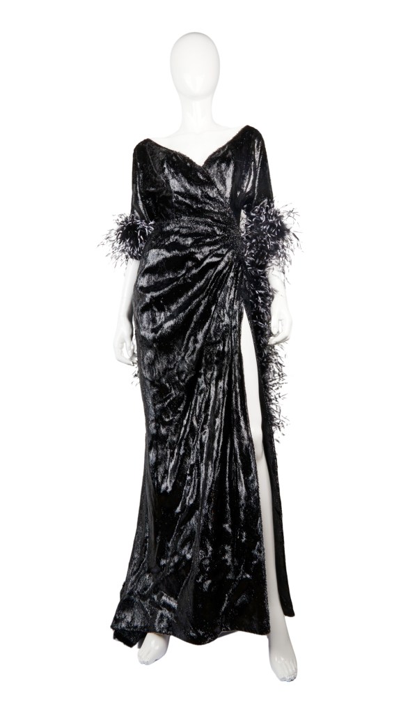 - A Mae West-inspired black and cellophane effect evening gown designed by legendary costume designer William Travilla, worn by Marilyn Monroe during the filming of her classic 1955 film The Seven Year Itch. It comes with a black and white feather boa (not film’s original), similar to the one worn by Marilyn with the gown. Marilyn wore this in a dream sequence scene, which was later cut from the film, where Richard Sherman (played by Tom Ewell) envisions his neighbor, the Girl (played by Marilyn) impersonating Mae West in this costume ($100,000-$200,0000)