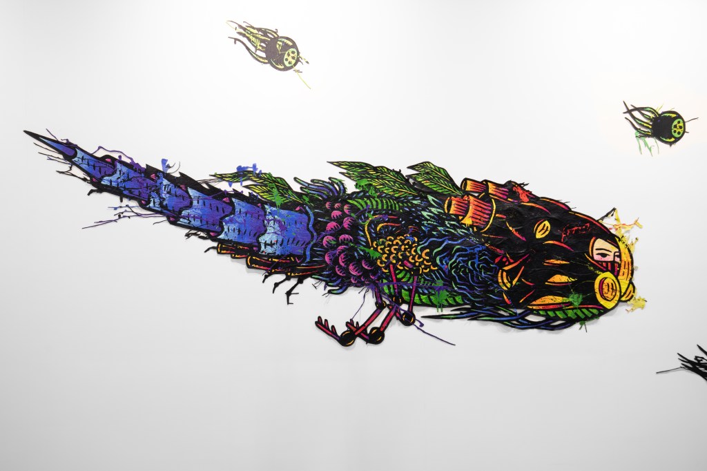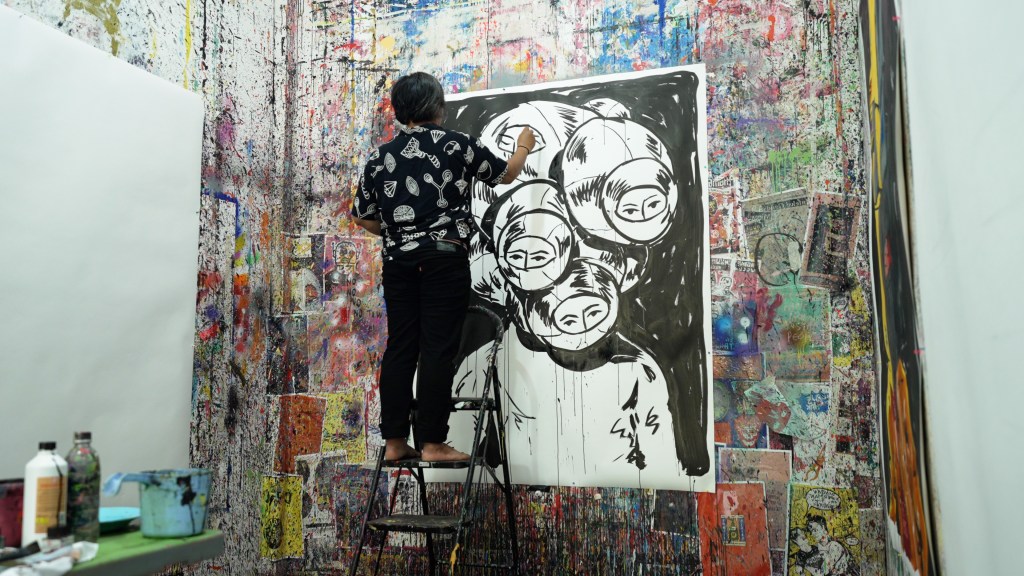 At the heart of his extensive body of work lies his background in street art and community-based projects. From mesmerizing paintings, intricate drawings, and exquisite embroideries to striking murals, captivating sculptures, and compelling videos, Nugroho’s creations are deeply rooted in the rich tapestry of local traditions as well as the vibrant urban landscape. His iconic visual vocabulary skillfully intertwines thought-provoking political messages with the compelling aesthetics of street art, graffiti, and comics.