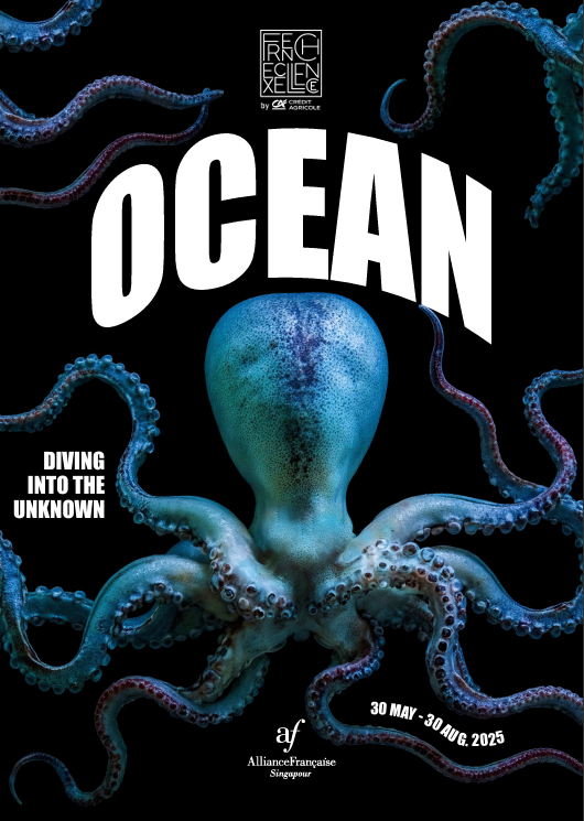Andrew Lau, President, Alliance Française de Singapour, conveyed his enthusiasm, remarking, “At Alliance Française de Singapour, alongside our core mission as a French language and cultural central centre, we are committed to fostering dialogues between other different cultures whilst engaging with the most pressing issues of our time. With OCEAN, we invite visitors to experience the ocean not just as a space of mystery and beauty, but also as a shared global responsibility. As an island nation surrounded by water, Singapore offers the perfect context for this exhibition—one where conversations about marine life, sustainability, and our collective future feel especially urgent and meaningful. The Alliance Française has supported The International Seakeepers Society that promotes oceanography research, conservation and education by hosting their songwriting competition in our theatre.”